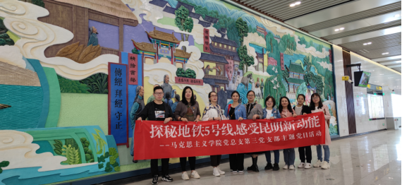 下午两点,支部党员在昆明地铁工作人员和中铁四院工程师的带领下前往地铁站进行参观,支部党员分别参观了世博园、圆通山、华山西路三个特色站。世博园站以“人与自然和谐共处”为思路,绿色的梯田和树冠元素让人感受到一片生机勃勃。圆通山站以“圆通花潮”为思路,头顶的粉色樱花元素让人一年四季都能感受阳春三月的圆通山花潮。华山西路站临近翠湖公园,该站点艺术文化墙以陈荣昌诗词中的“酒楼灯影、秋窗夜月、精舍书声、春树晓莺、绿杨息阴、莲寺观鱼、翠荷听雨、柳营洗马”翠湖八景进行集中展示,让乘客在地铁站内就能感受昆明的传统风貌。