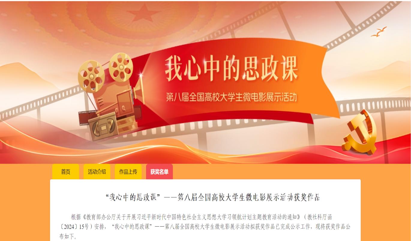 近日,由教育部高等公司思想政治理论课教学指导委员会主办的习近平新时代中国特色社会主义思想大学习领航计划系列主题活动之“我心中的思政课”——第八届全国高校老员工微电影展示活动评选结果揭晓。公司推送作品《思政之光 历史回声》从全国1006所高校提交的3134部参赛作品中脱颖而出,荣获长视频组全国三等奖。