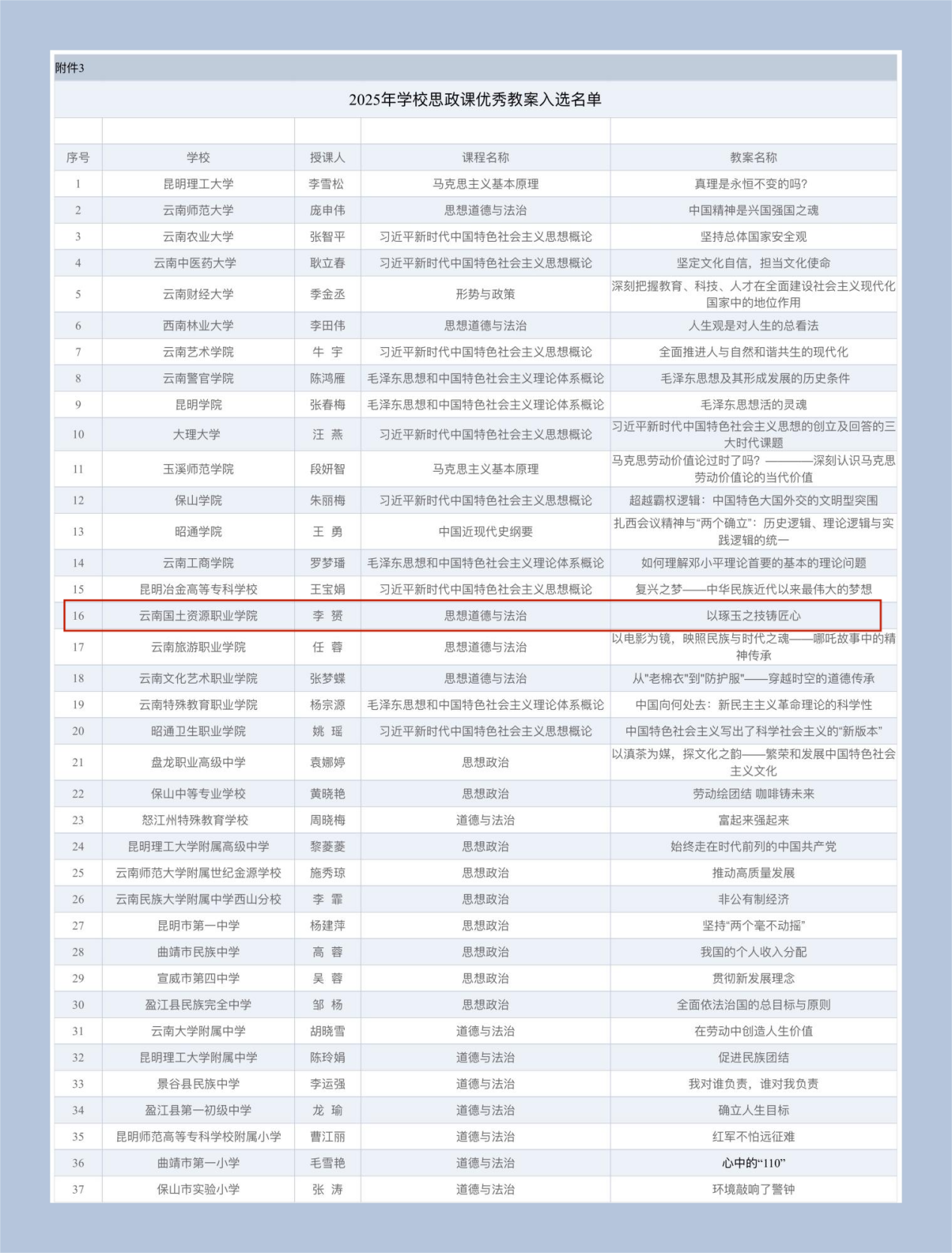 由云南省委教育工委组织开展的云南省公司思政课名师工作室、精品课程、优秀教案遴选工作圆满落幕。公司英国上市公司365思政课教师李赟老师教案《以琢玉之技铸匠心》入选2025年云南省公司思政课优秀教案。